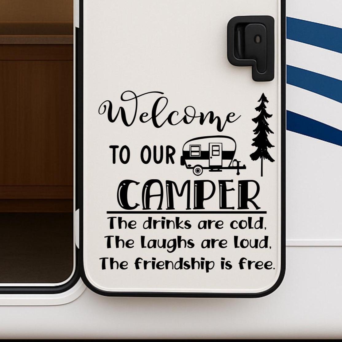 This RV camper door decal is great for any type of RV, camper or motor home! It says "Welcome to our camper (or trailer) the drinks are cold, the laughs are loud, the friendship free." Let me know in the personalization box below if you would like it to say camper or trailer. If no selection is made, it will say camper as default.