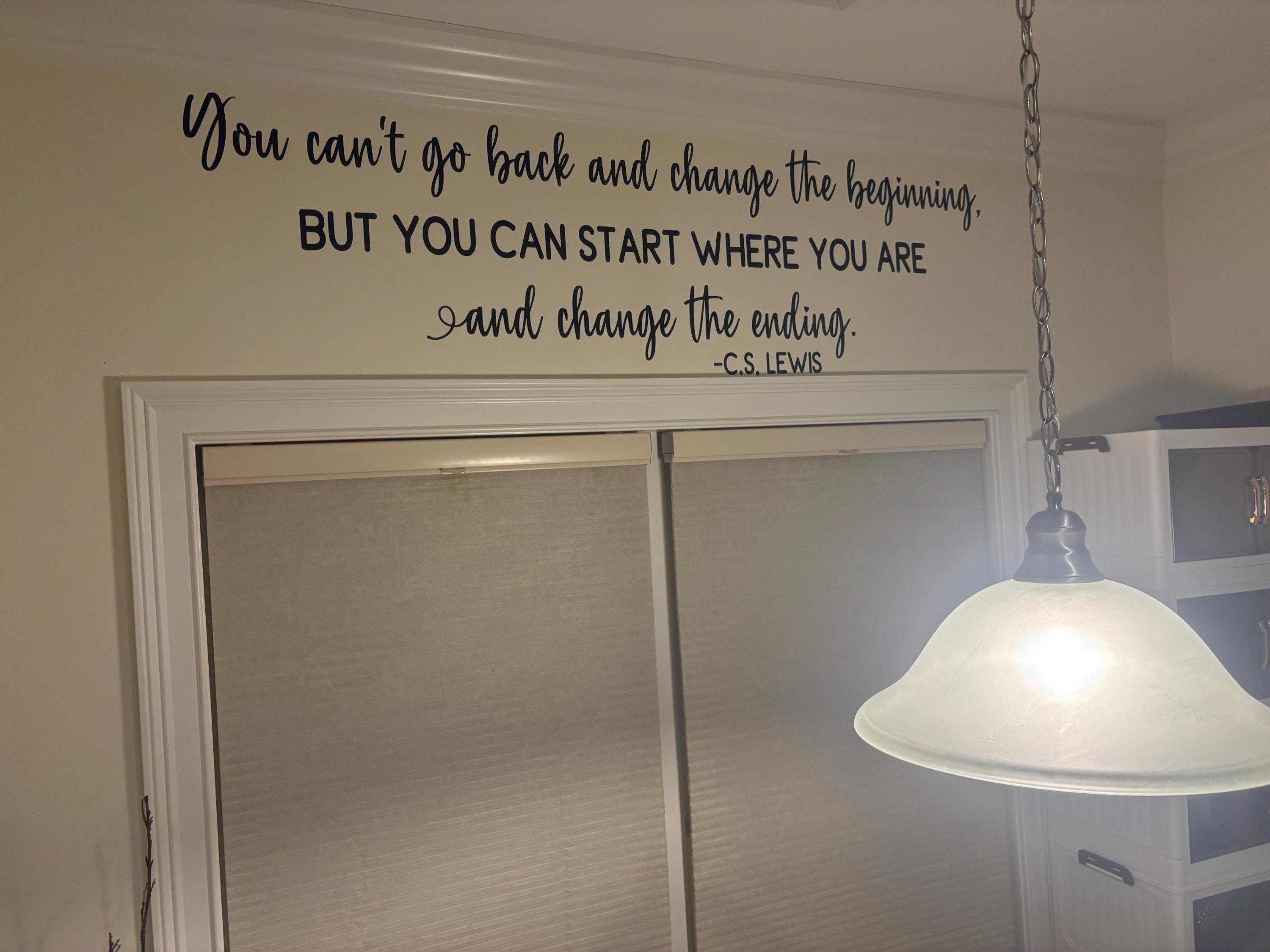 This CS Lewis inspirational quote decal says, "You can't go back and change the beginning, but you can start where you are and change the ending." This is great for a classroom, office or anywhere else you would like some inspiration.