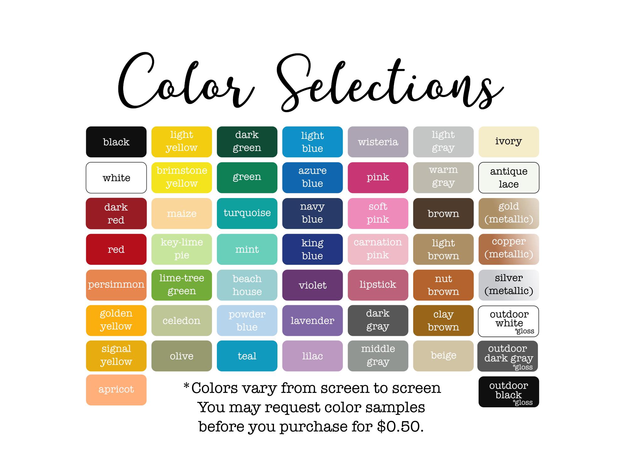 I will include a free test decal to make sure it will stick to your chosen surface before you apply it. Check out all of the colors available! If you would like a decal larger or smaller than the sizes listed, just let me know and I will make it to meet your needs. Prices vary depending on size. If you have any special requests, enter them in the notes to seller box at checkout.