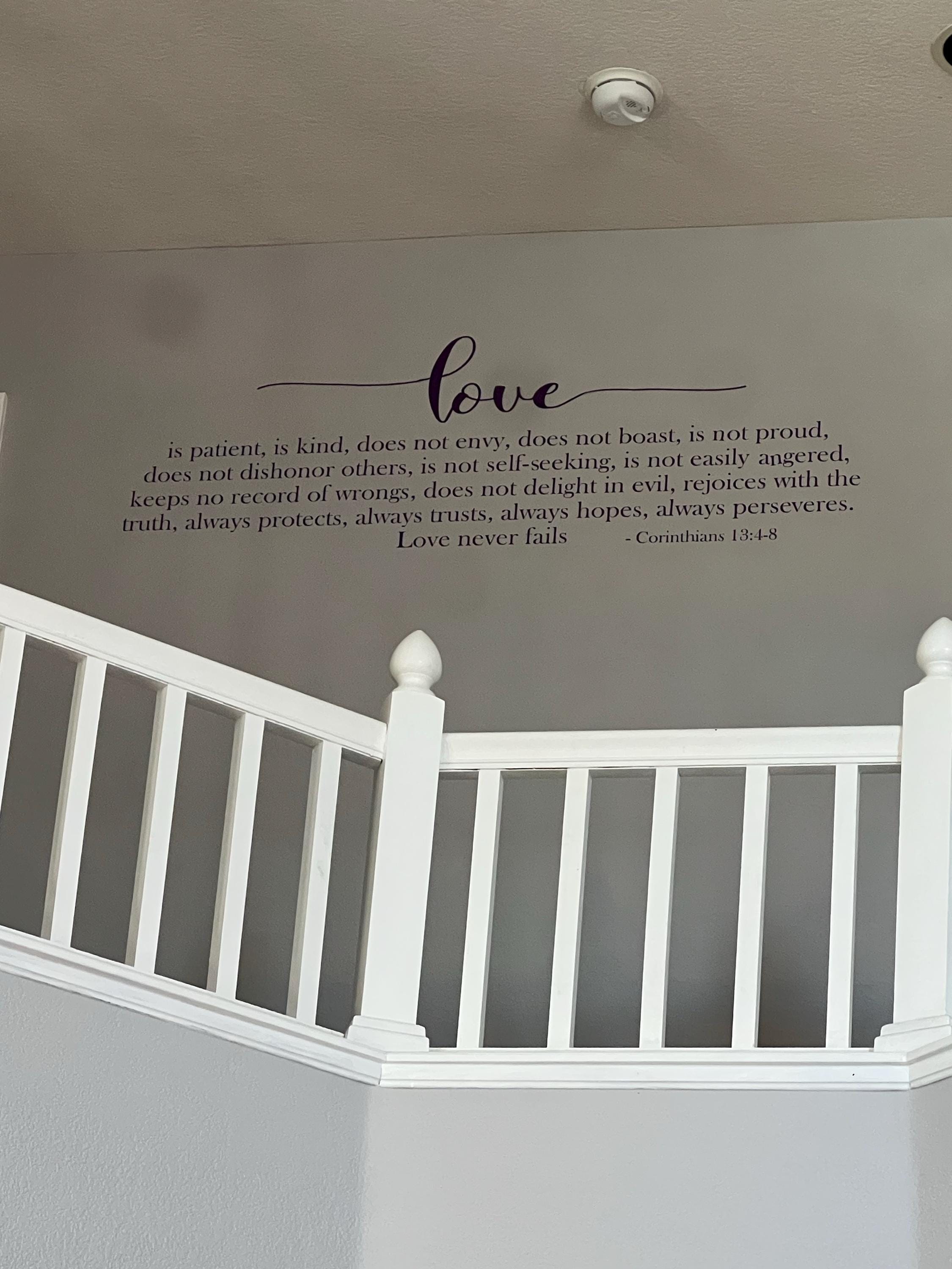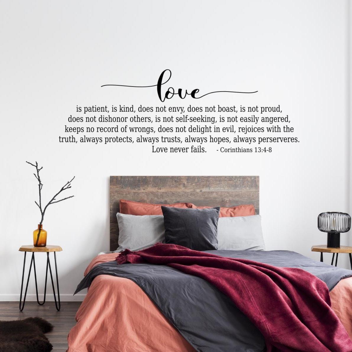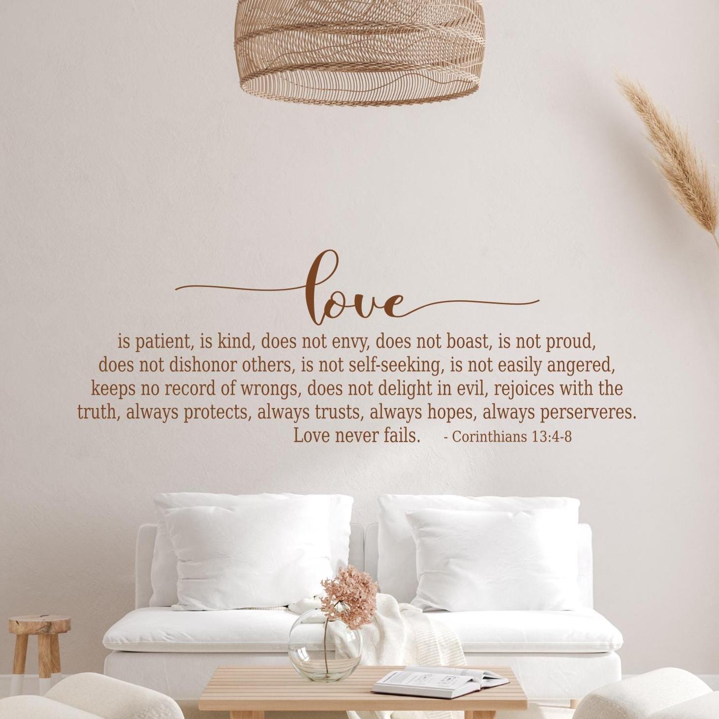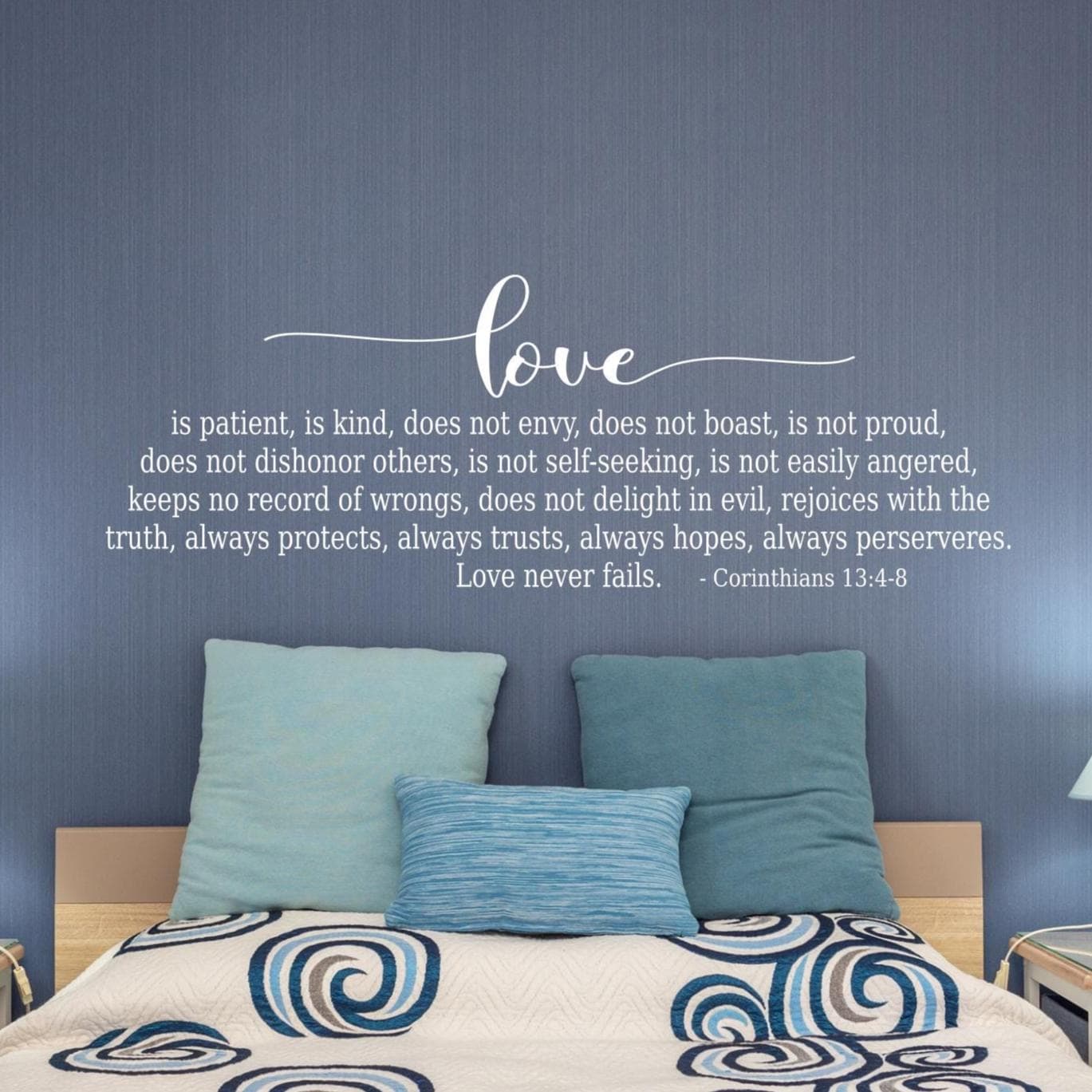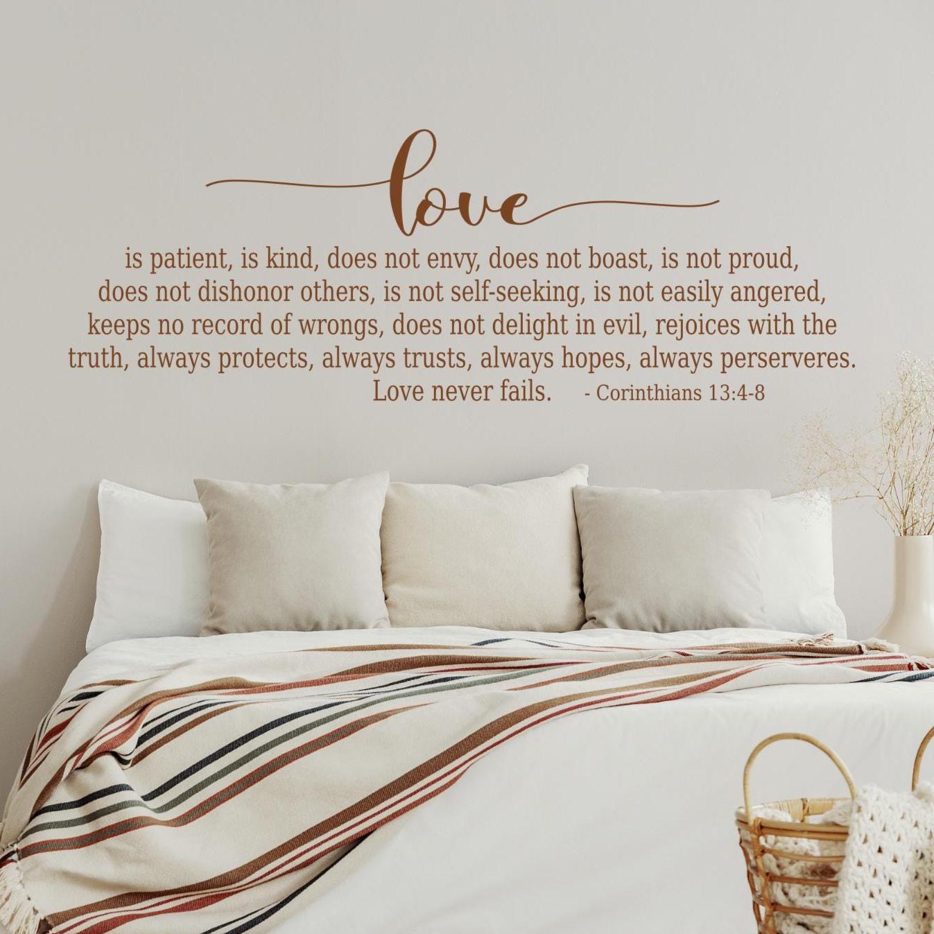 This scripture wall art vinyl decal for master bedroom says, "Love is patient, love is kind... Love never fails. Corinthians 13:4-8. This bible verse looks great above the bed.