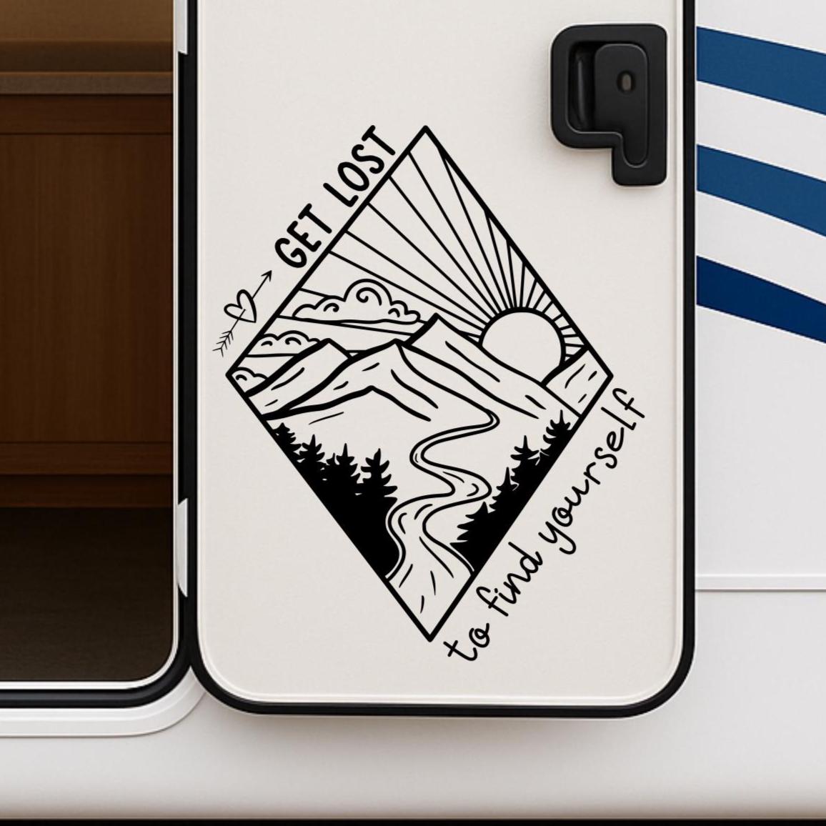 This rv decal says "Get lost to find yourself" and has a geometric mountain design. Sizes are width by height.