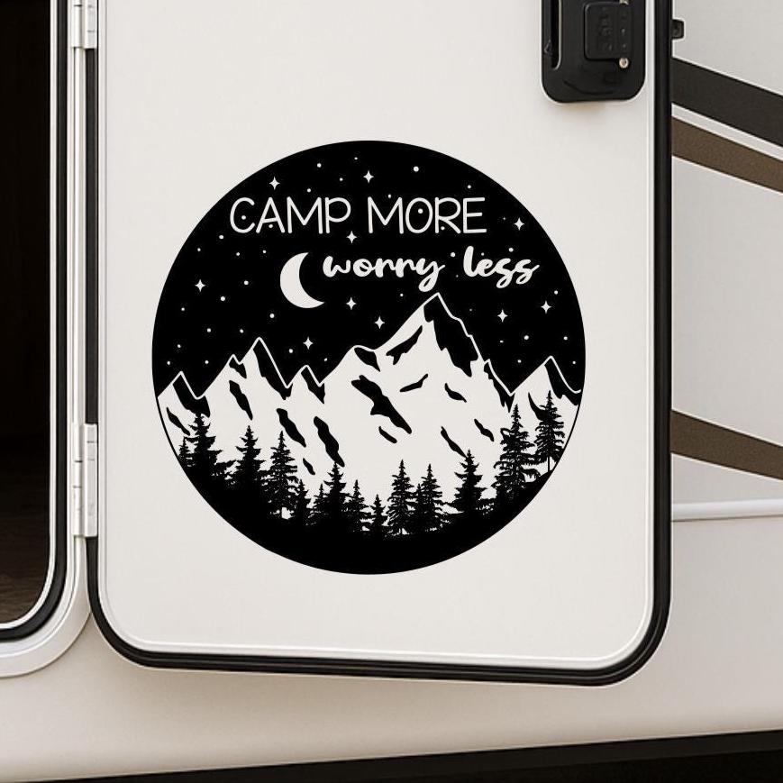 This rv decal says "Camp more worry less" and is round with mountain, trees and night sky design.