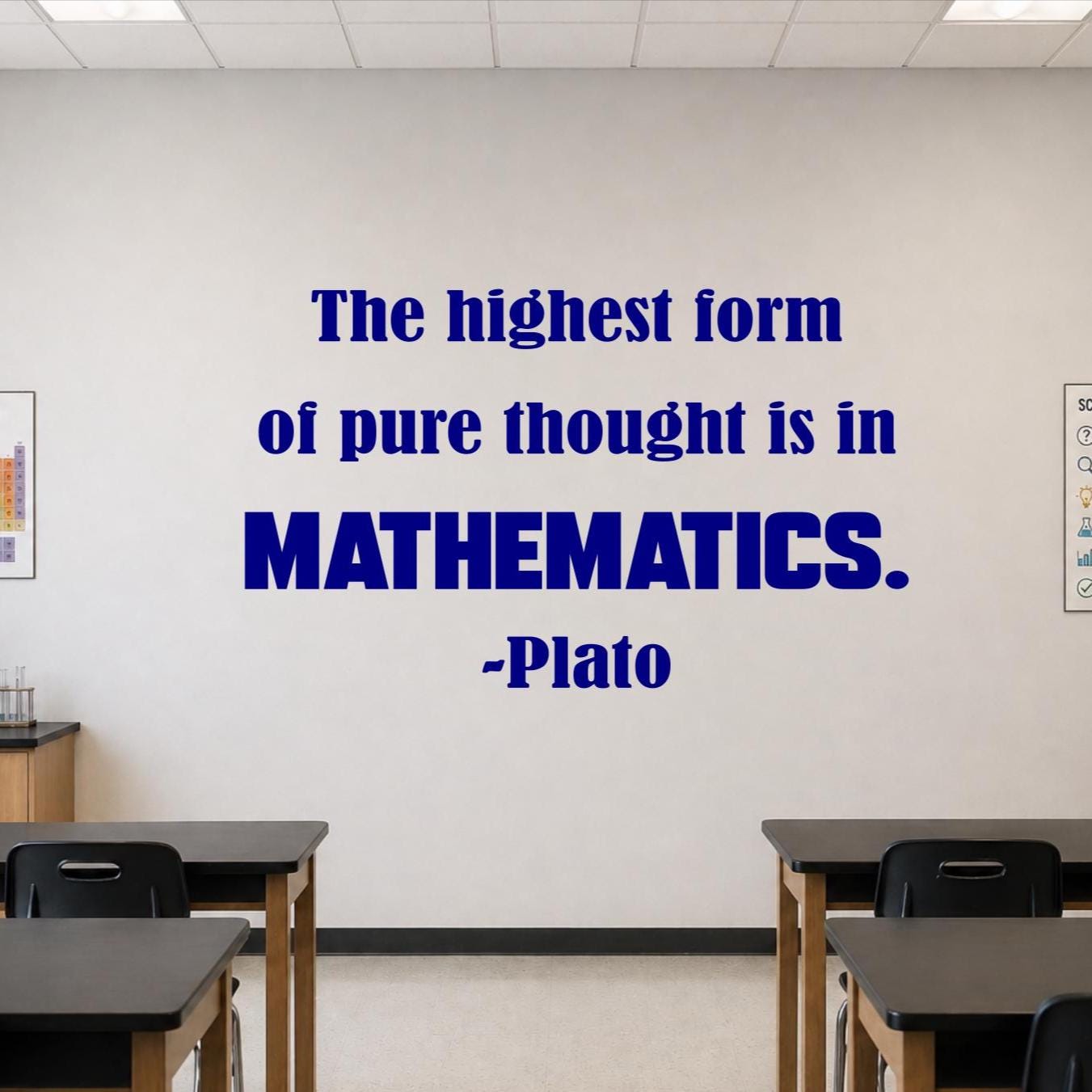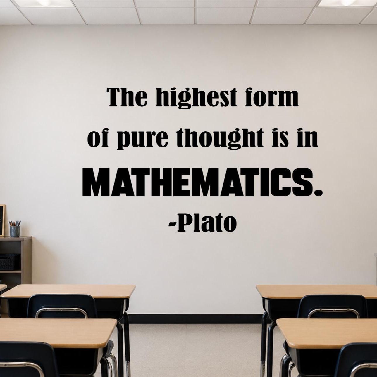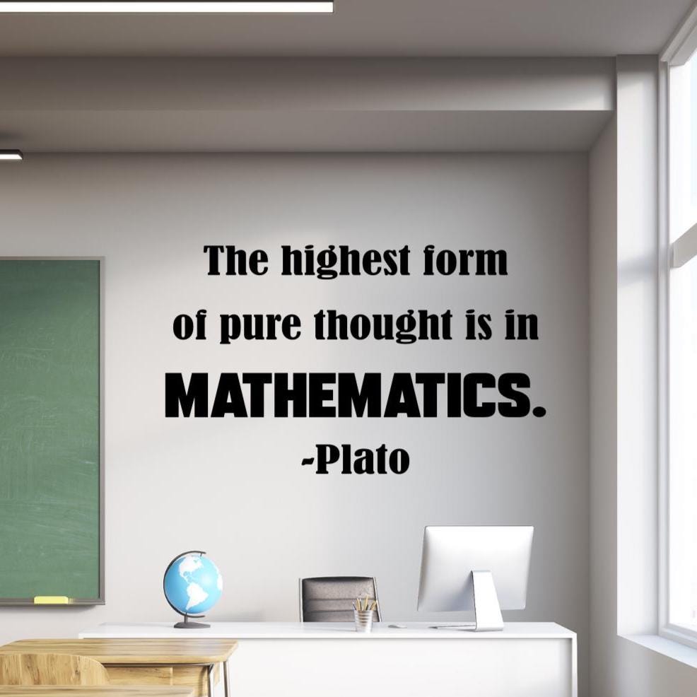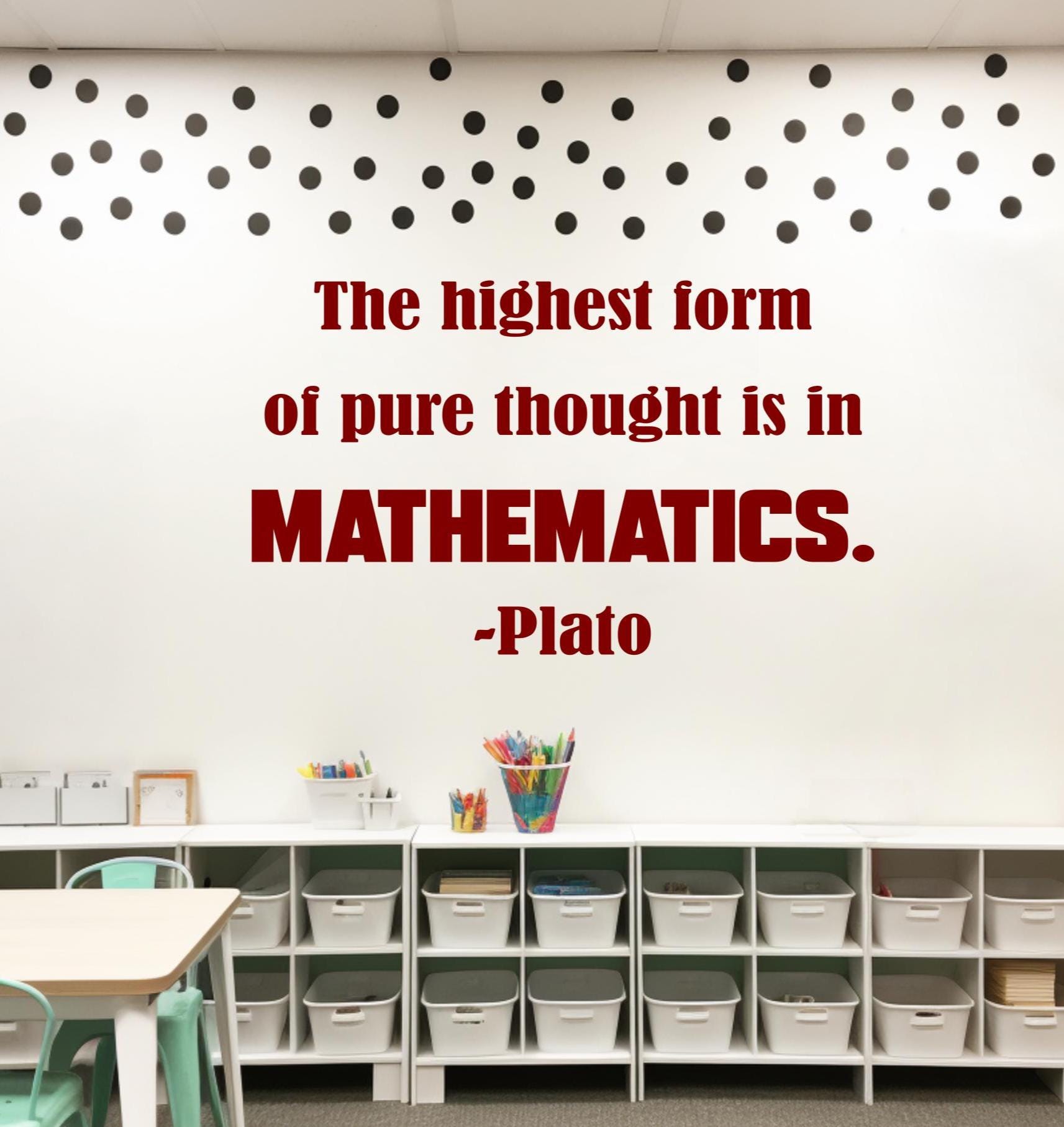 This philosophy and mathematics quote is perfect for teachers and students. It says "The highest form of pure thought is in mathematics. -Plato" This math classroom wall decor can be made in any color to match your unique space.